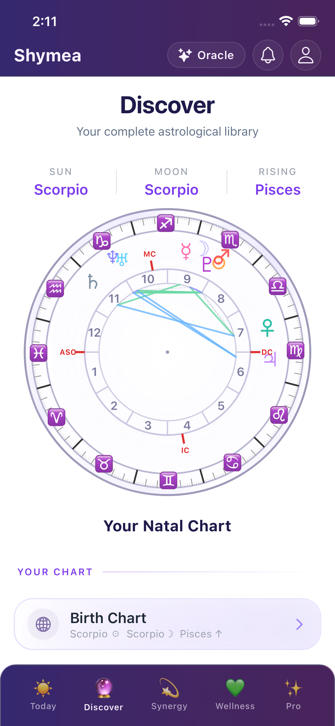 This allows Shymea to calculate an accurate Western astrology natal chart based on real astronomical data.